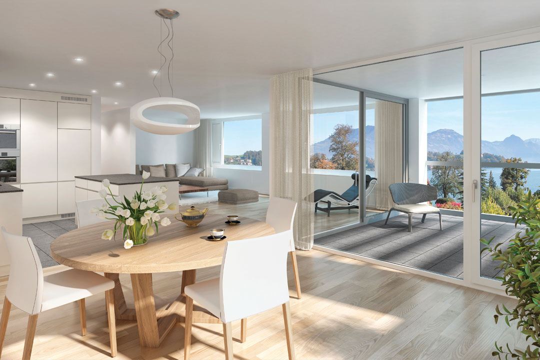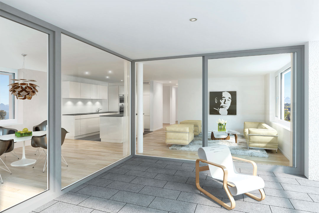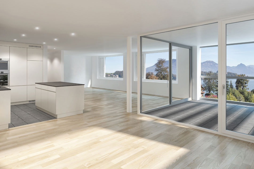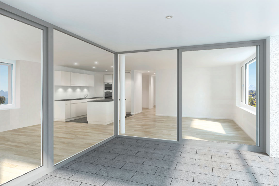 Die Wohnungen verfügen über einen hohen Ausbaustandard. Alle Wohn- und Schlafräume sind mit versiegeltem Eichen-Parkett ausgelegt. In Nassräumen und Küchen sind pflegeleichte Feinstein-Bodenplatten in elegantem Anthrazit verlegt. Die weissen Wände, die grossen Fenster in den Zimmern und die raumhohe Verglasung zur Loggia hin sorgen für viel Licht im Inneren und grosszügige Sicht nach aussen.